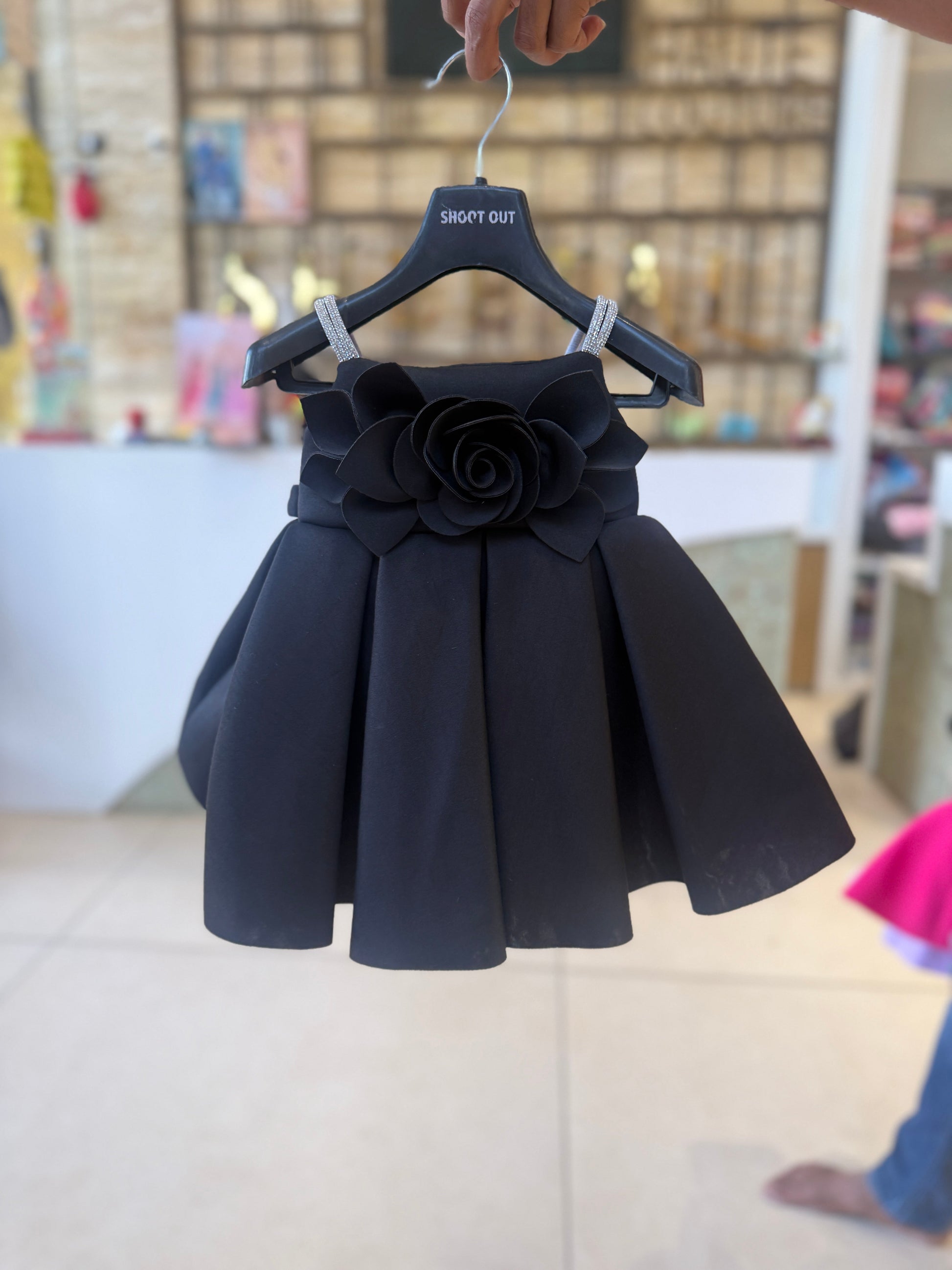 - ๐ Adorable Design: Elegant black sleeveless baby frock with a stunning 3D rose applique centerpiece and pleated skirt