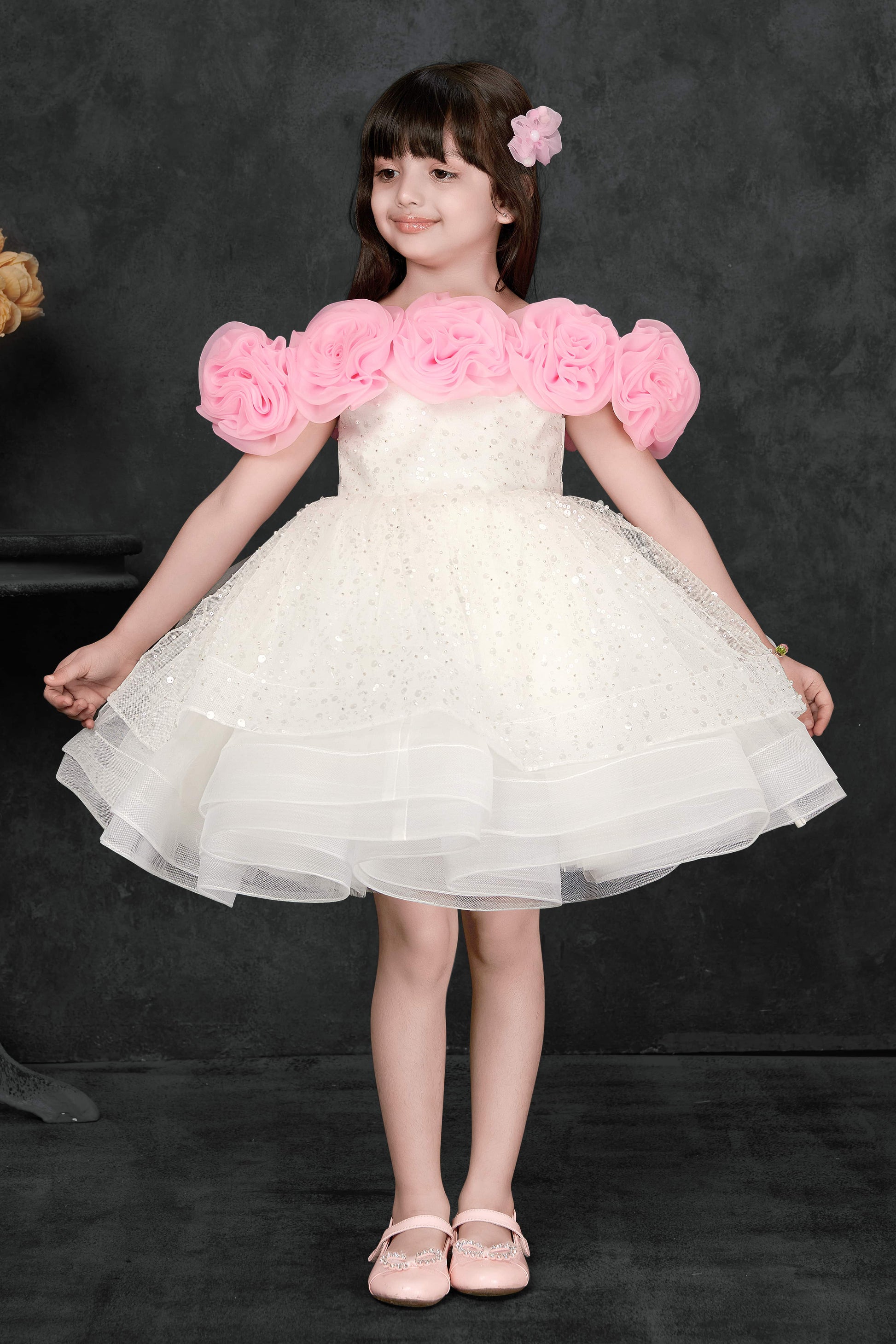 Ivory White Tulle Ball Gown with Pink Rosette Sleeves and Sparkle Overlay for Girls