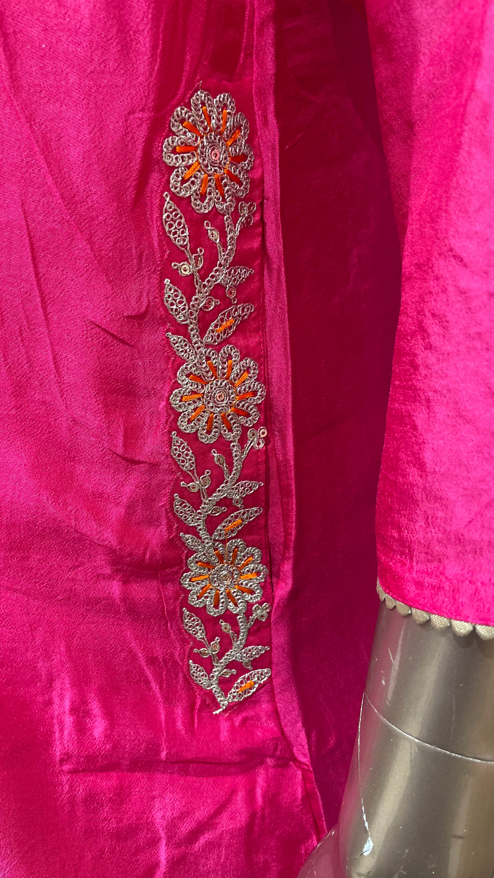 - π Designer Sharara Set: Beautiful pink leheriya striped kurta with golden zari embroidery, paired with crushed silk sharara pants and a matching dupatta