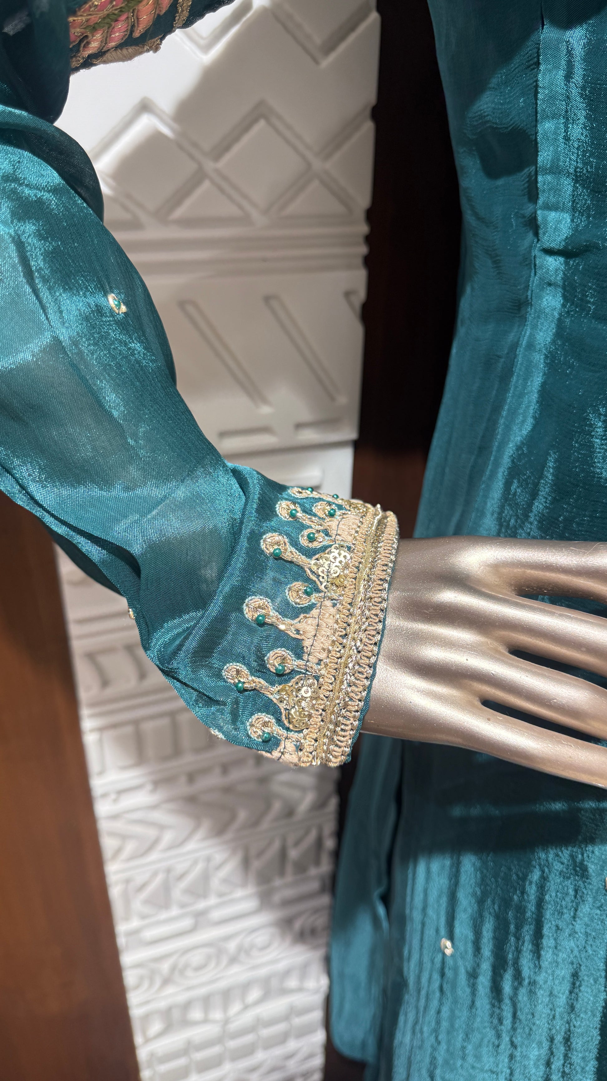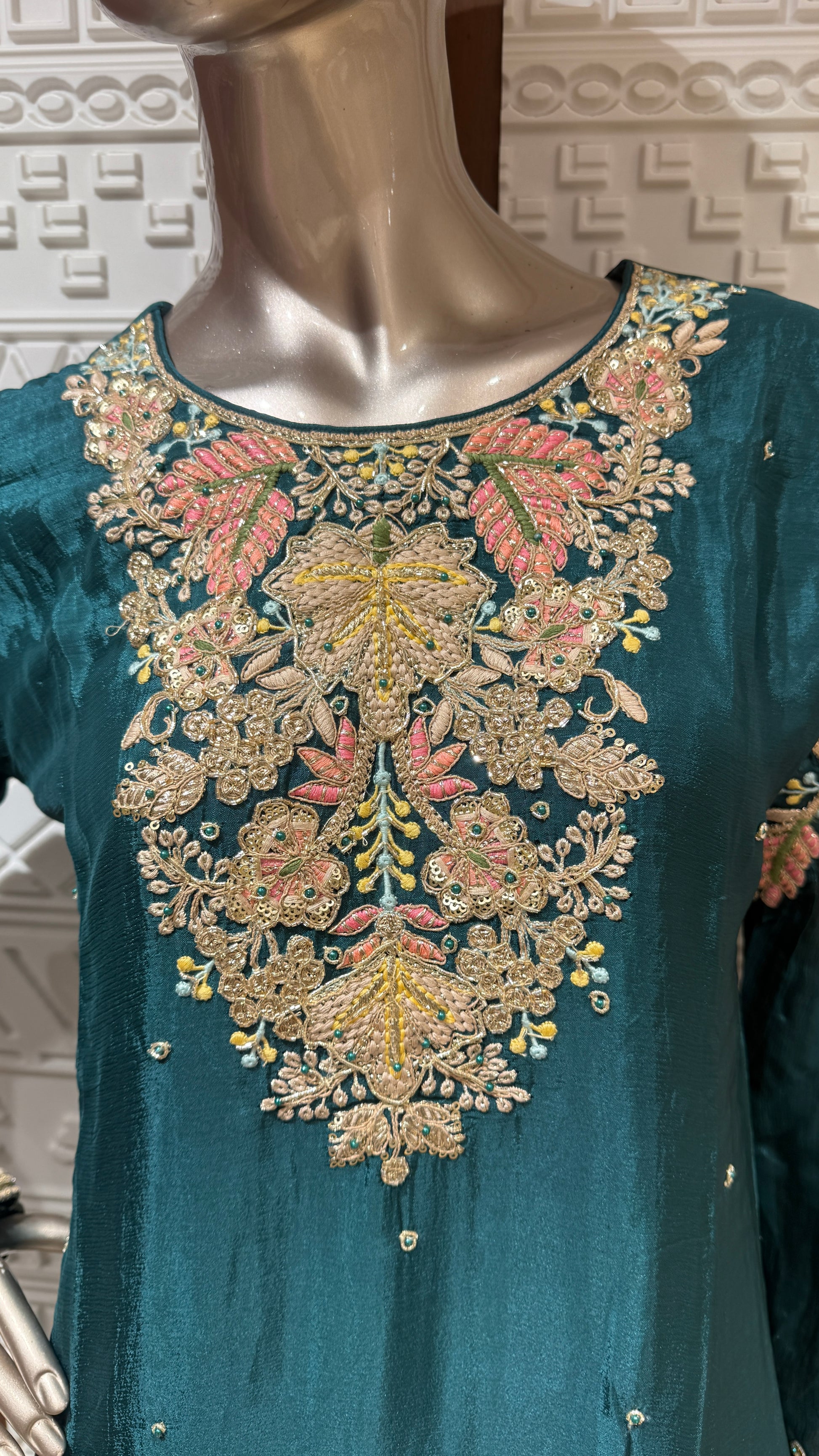 - โจ Design Highlights: Round neckline with ornate golden zari and sequin embroidery forming a beautiful collar design, embellished front panel with delicate golden work, full-length sleeves with embroidered cuffs and borders, wide-leg sharara pants with scalloped golden embroidered hem featuring intricate floral motifs