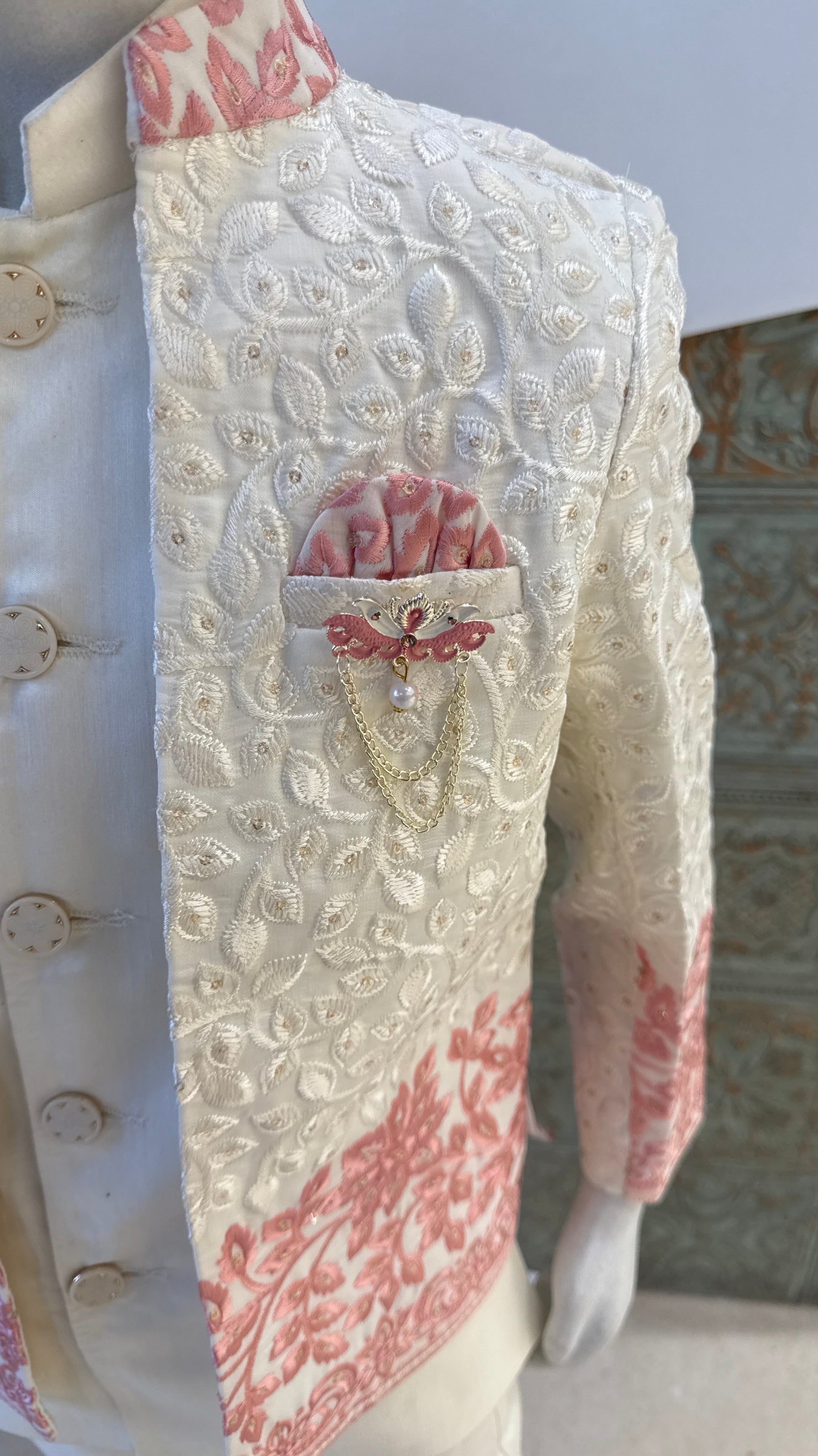 White Embroidered Indo-Western Jacket with Pink Border for Boys