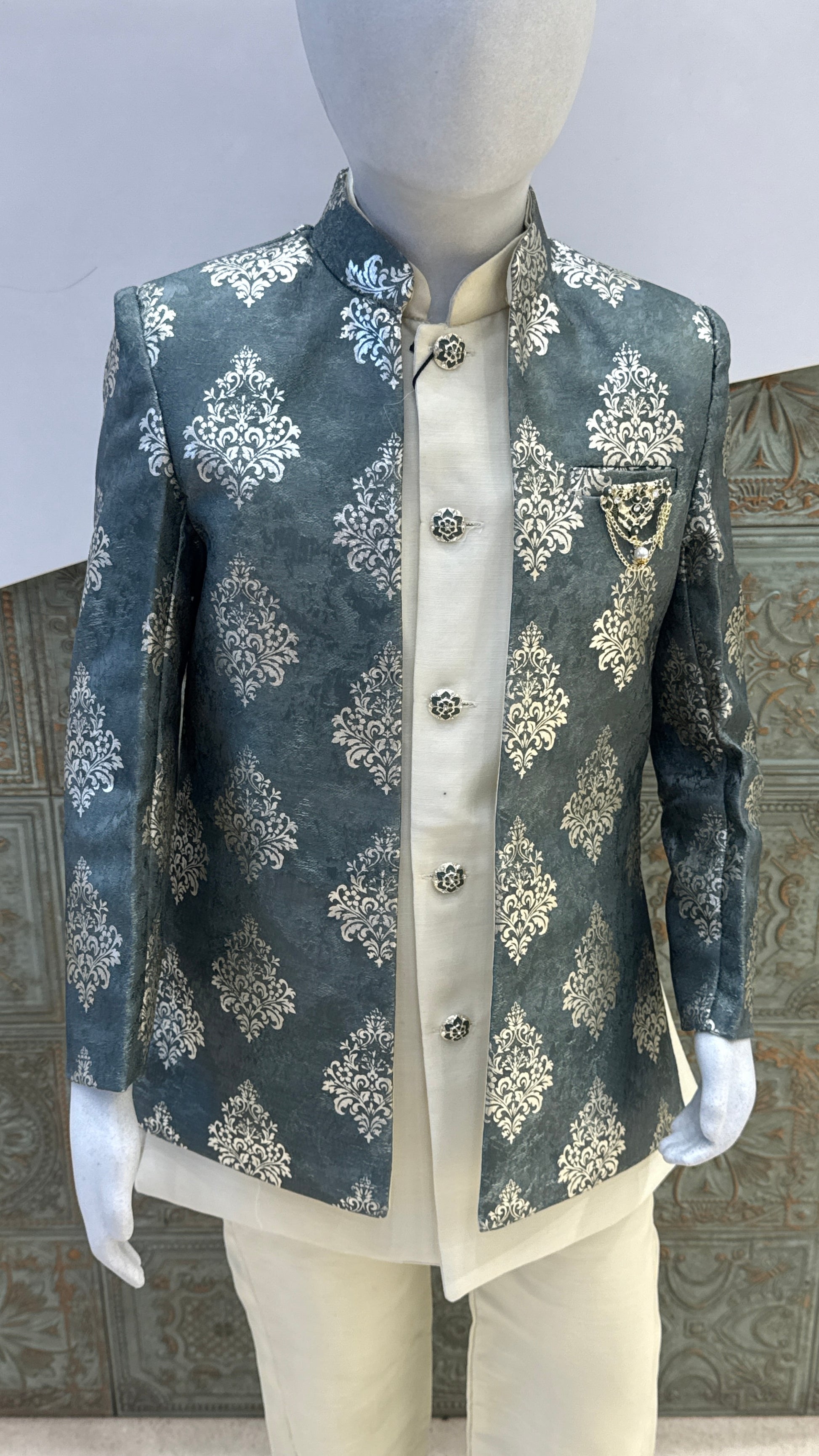 Grey and Silver Embroidered Indo-Western Jacket for Boys