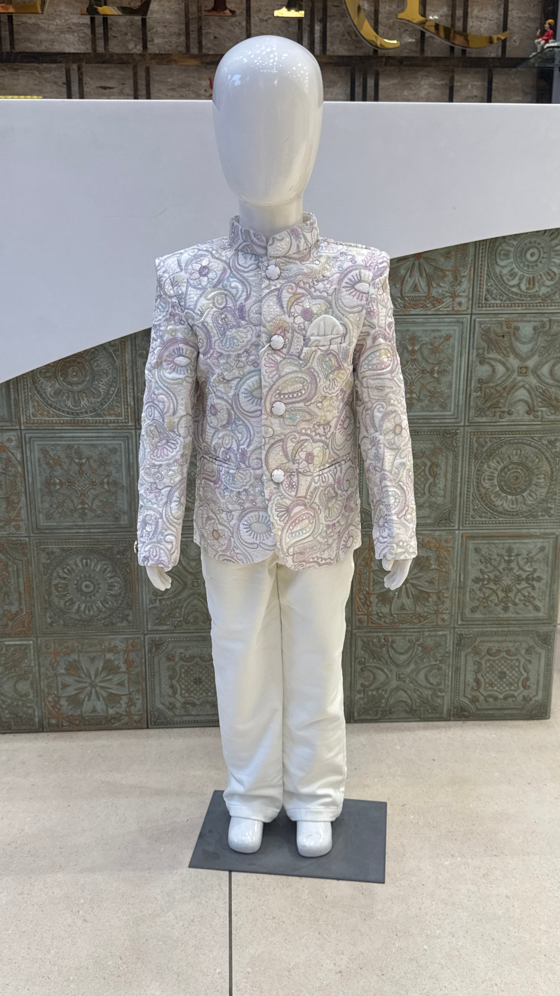 White Embroidered Indo-Western Jacket with Pastel Details for Boys